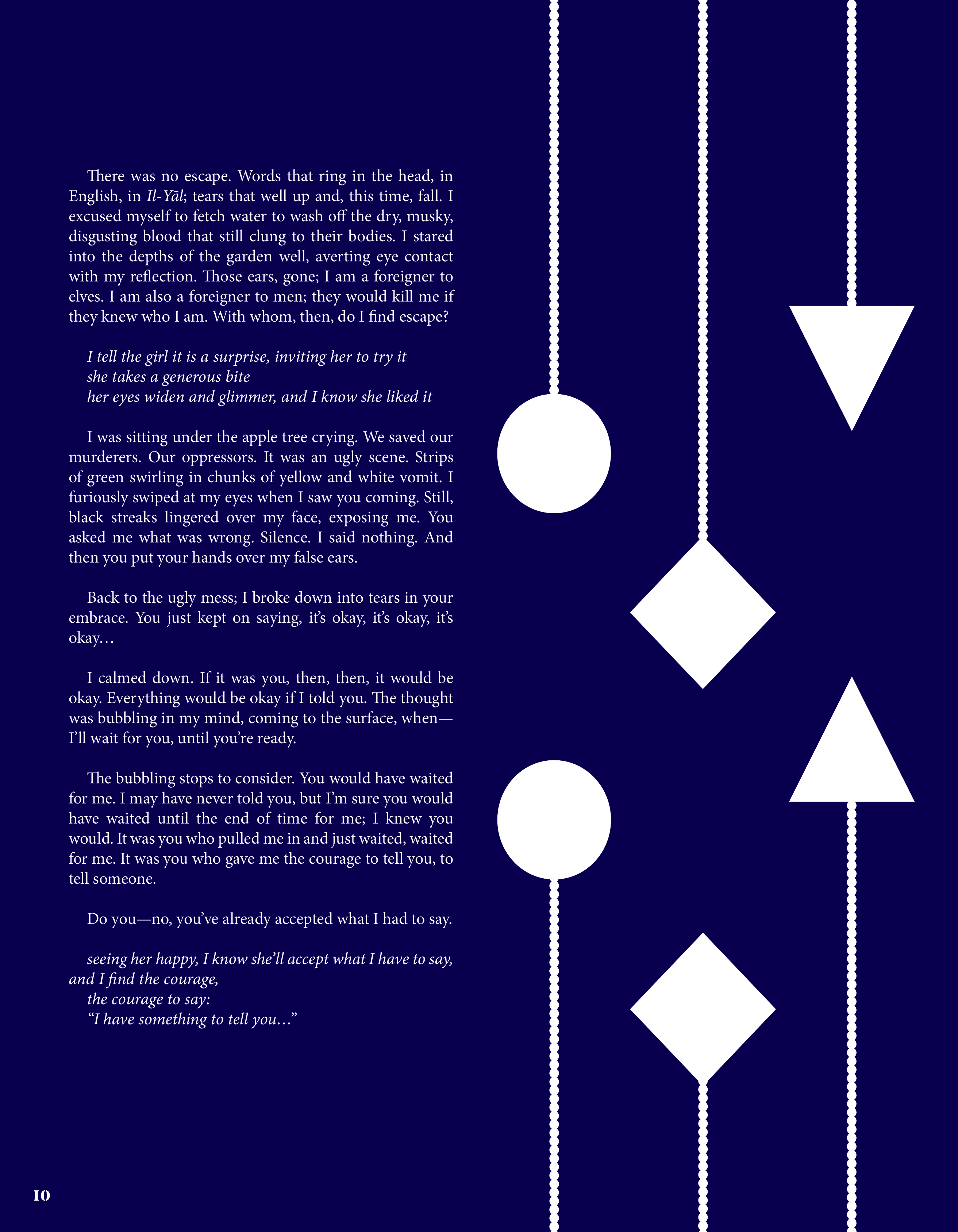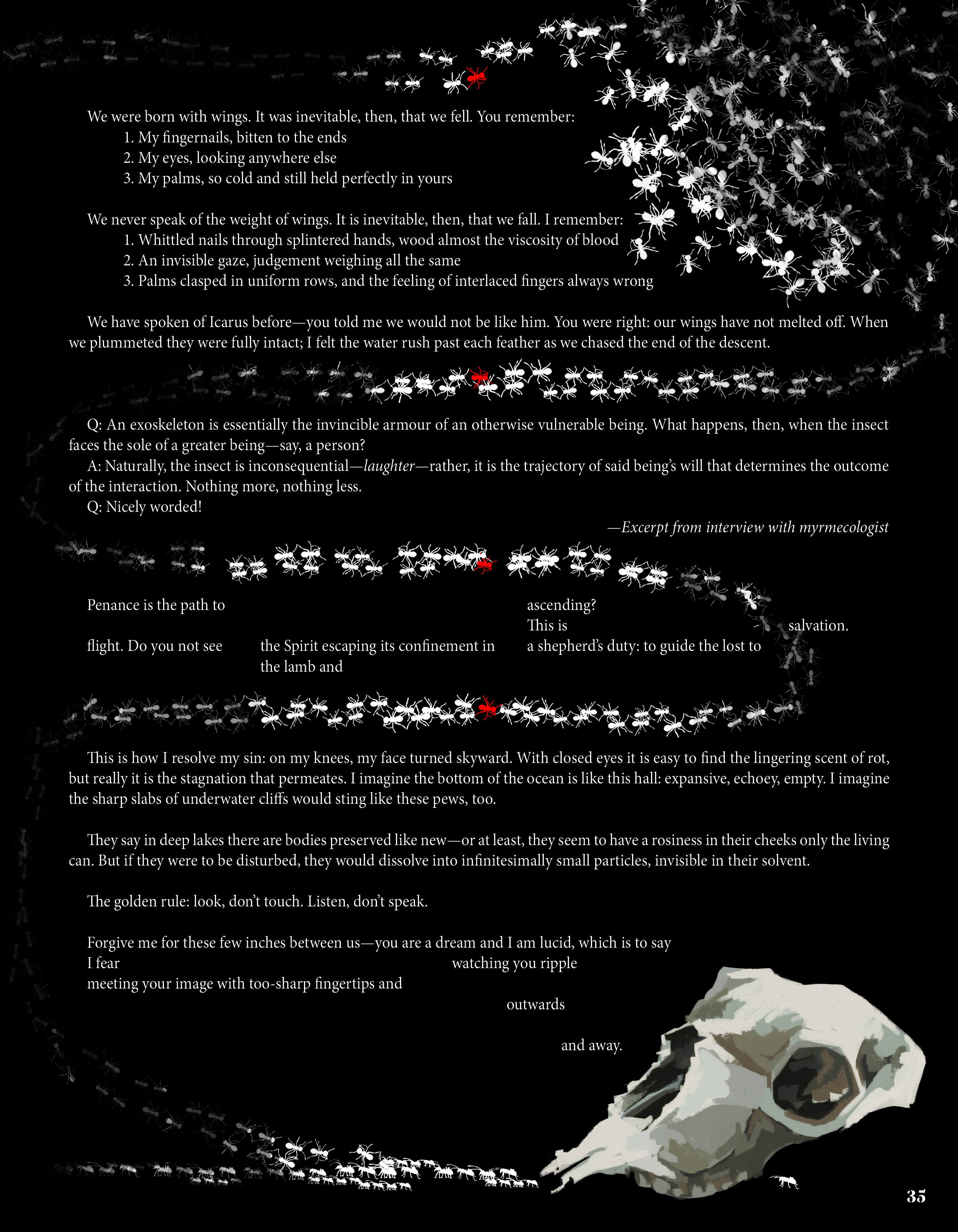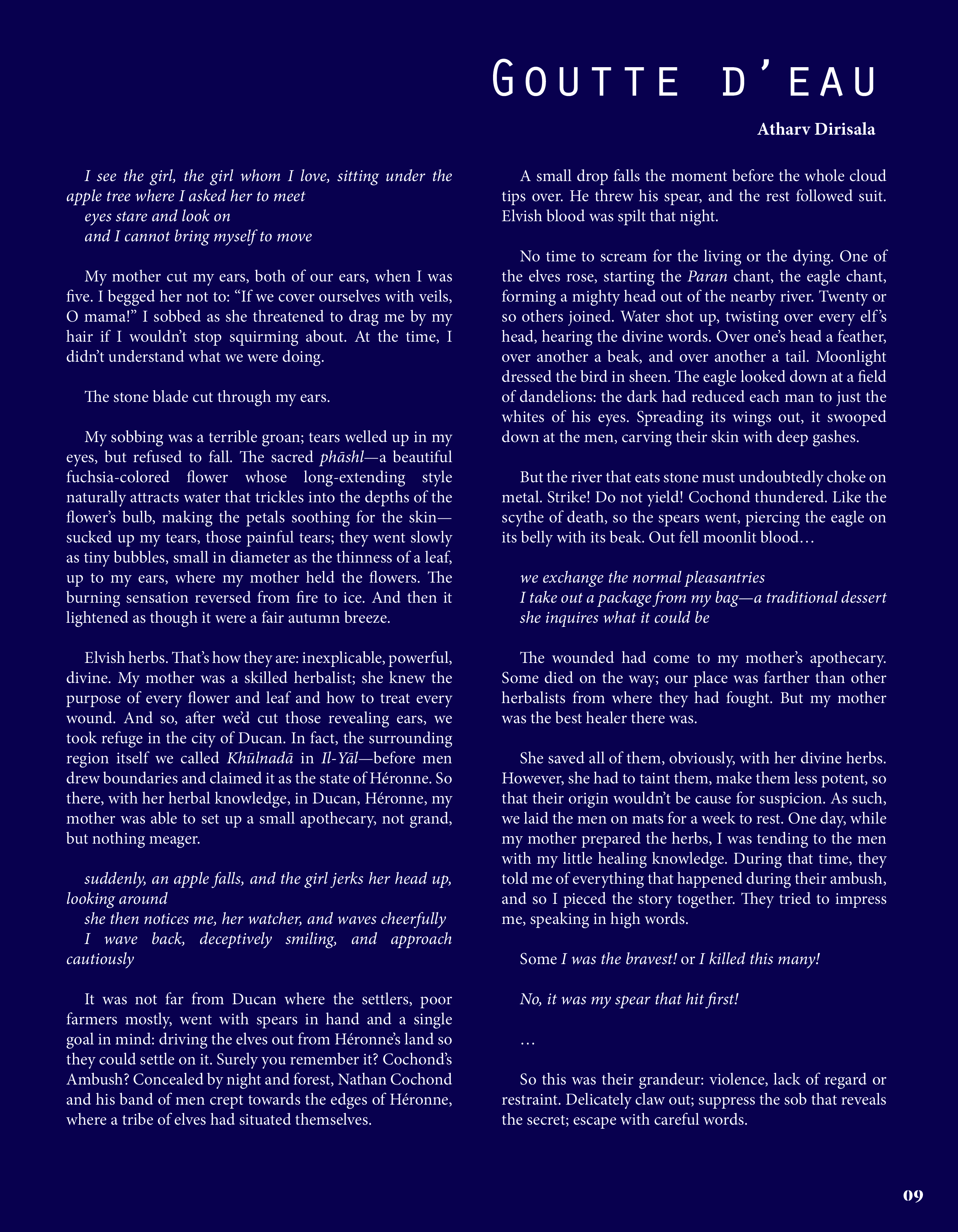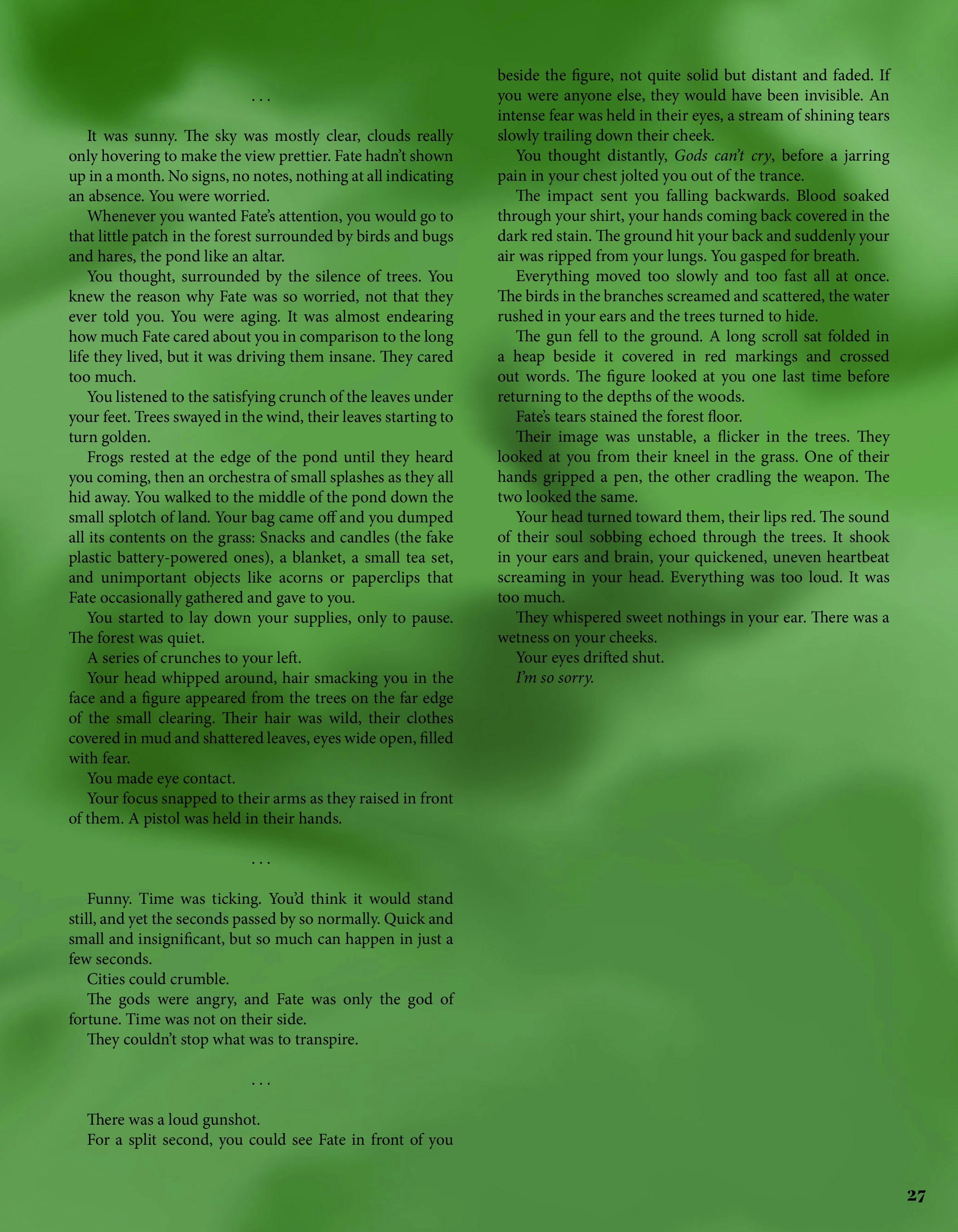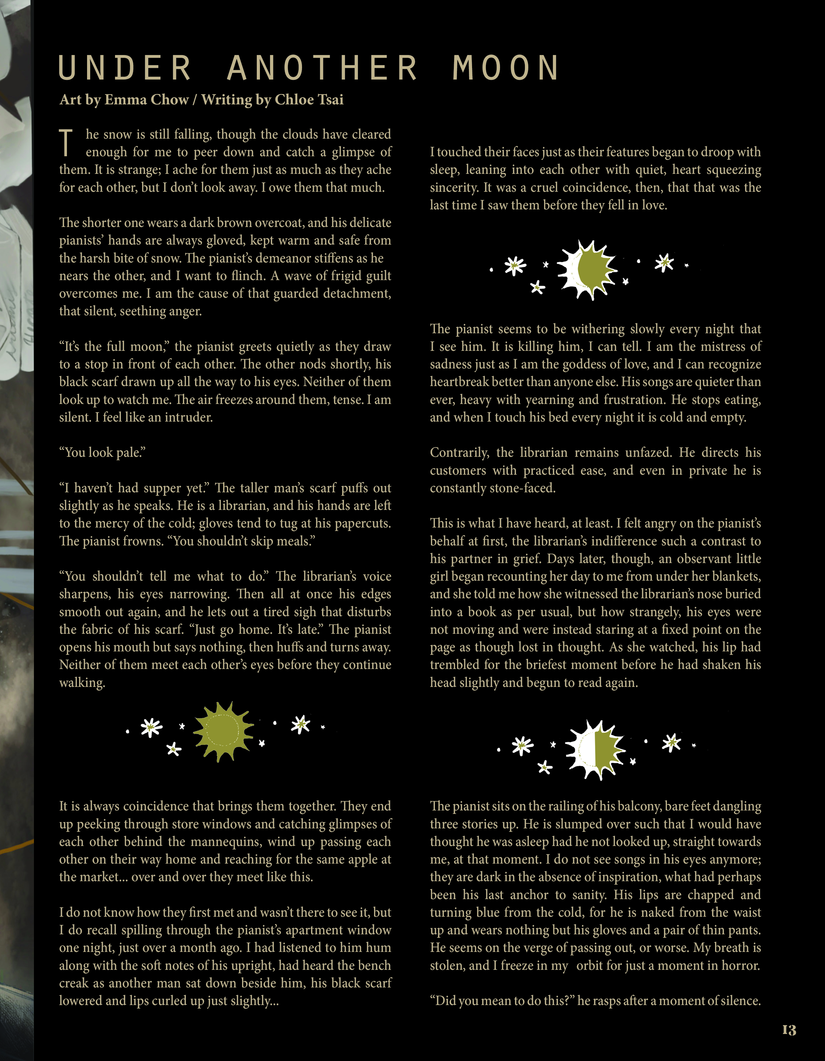 With our work, we navigate that spiritual space. Volume 9: Numen is a testament to art's acuity— maybe we can't contain the divine, but we can trace the dappled shapes of their shadows, searching for their answers.